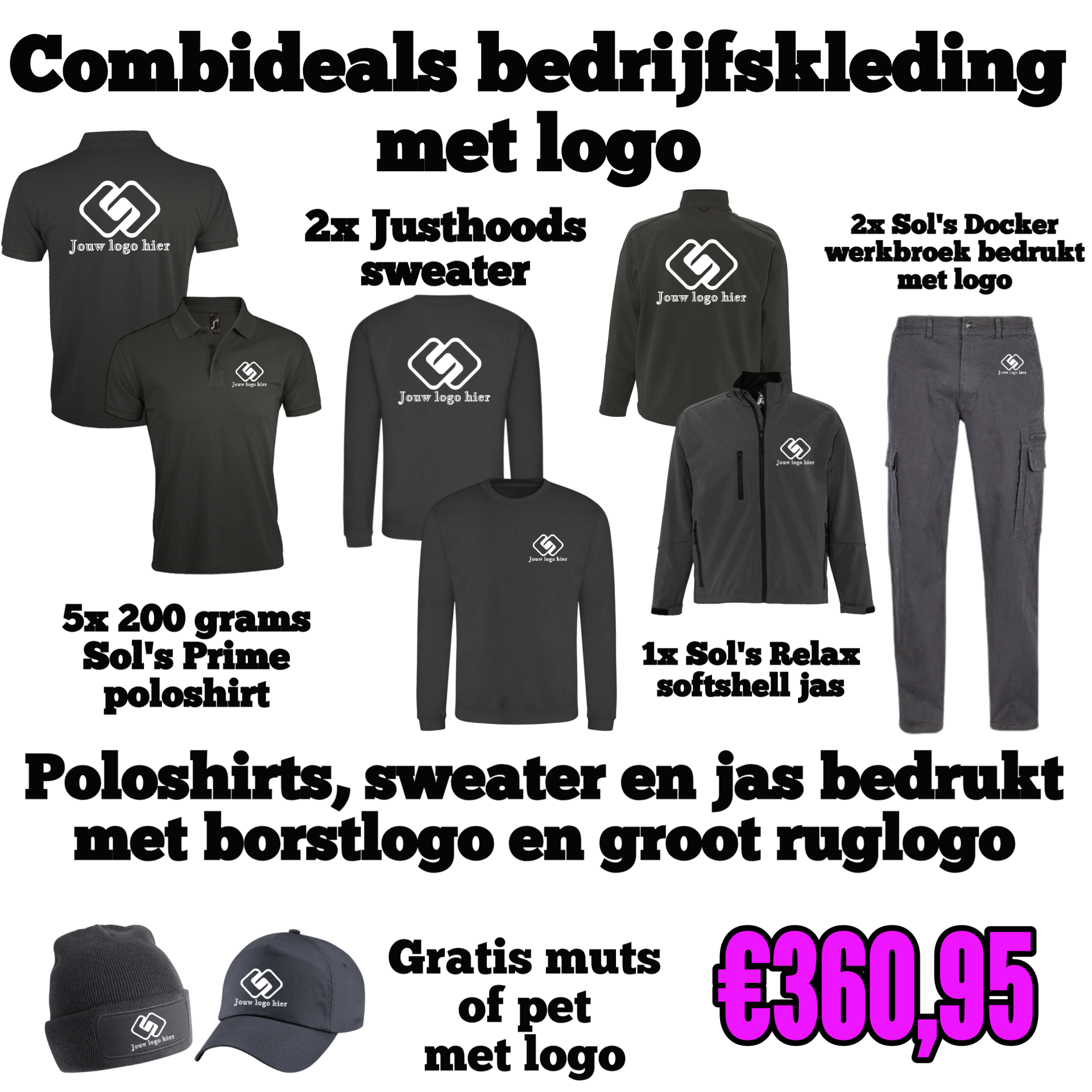 Combideal 12 bedrijfskleding bedrukt met logo (5x poloshirt, 2x sweater 2x werkbroek en 1x Softshell jas bedrukt met logo)